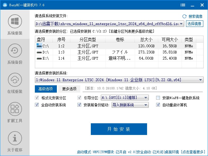 为了方便,我使用 EasyRC 进行重装。EasyRC 不仅可以帮我们干掉烦人的 Windows Defender,自动导入驱动,还具有无人值守功能,不需要太多人工操作,而且基础配置在原系统上就能搞定,PE 都不用进,大大降低了风险(我可没接广,这玩意真的好用)在制定好完备的计划后,Just do it。