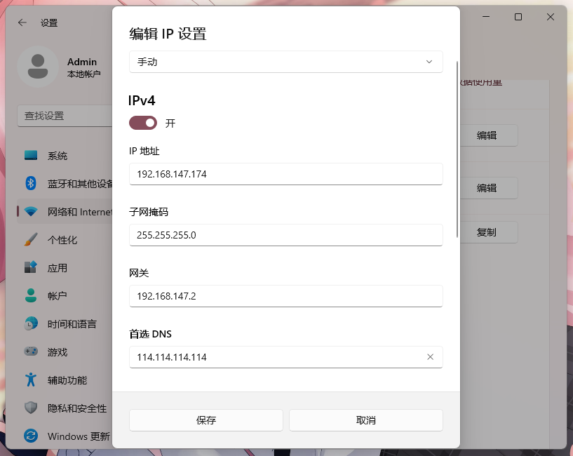 几天后,我又发现一个问题,就是那个 IP 突然连不上了,但是 Ping 它 Ping 的通,经过我和 AbCd 的排查,Win11 的 IP 貌似是动态的,这个好办,在高级设置中禁用自动 DHCP ,然后自己配置 IPv4,DNS,子网掩码之类,至于为什么 Ping 的通,那估计是局域网内其他设备。